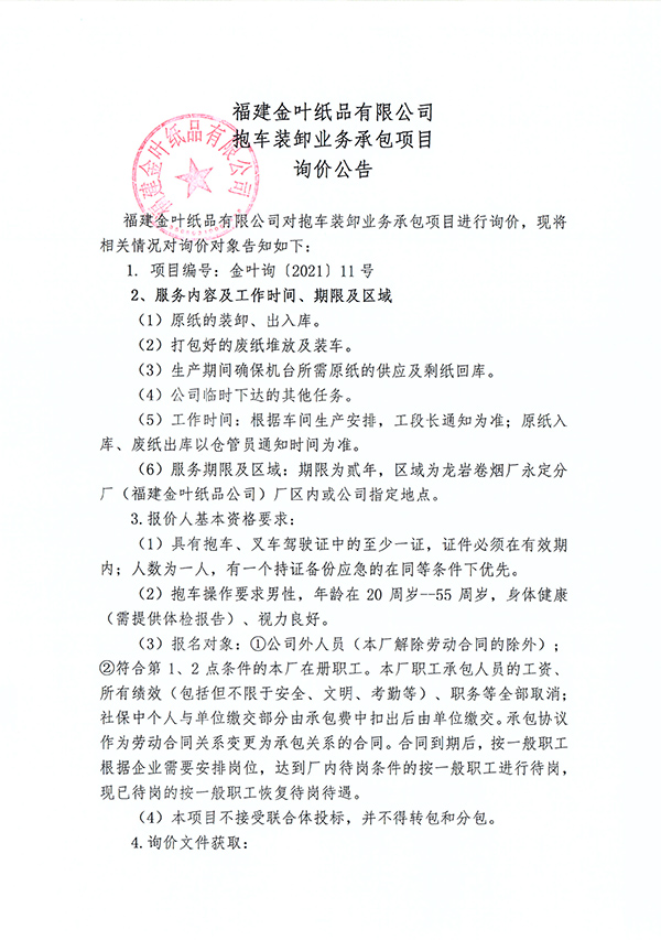 金葉紙品公司抱車裝卸業(yè)務(wù)承包項(xiàng)目詢價(jià)公告