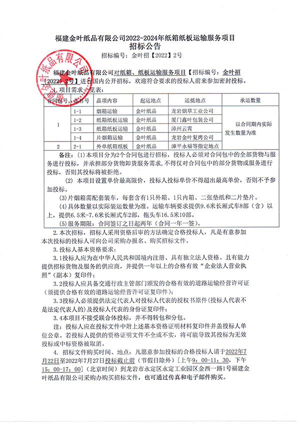 2022-2024年紙箱紙板運(yùn)輸服務(wù)項目招標(biāo)公告(二次招標(biāo))