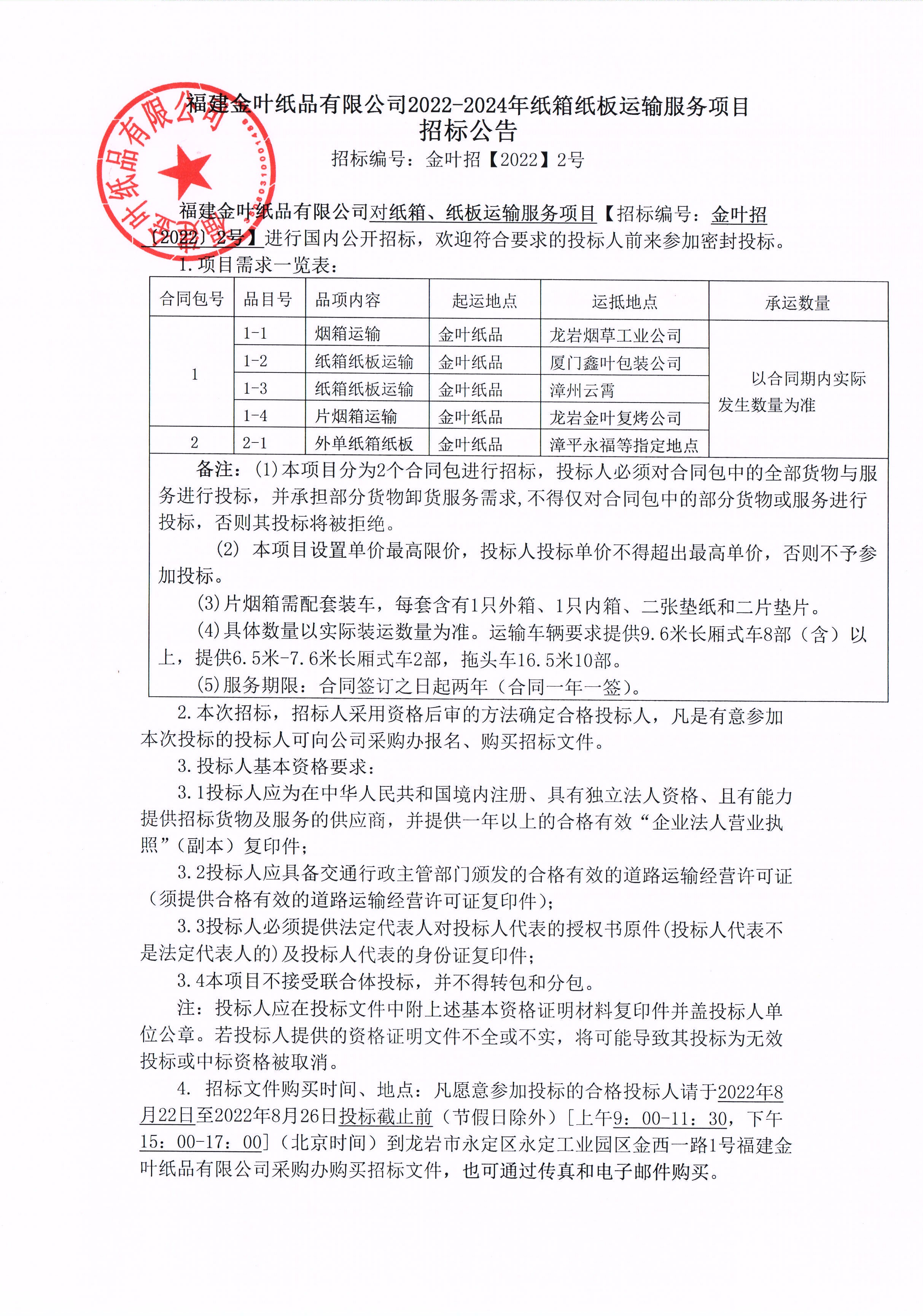 福建金葉紙品有限公司2022-2024年紙箱紙板運輸服務項目招標公告
